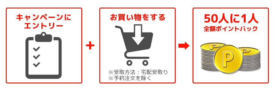 期間中、宅配受取りのご注文50件に1件のご購入金額を、全額e-honポイントでプレゼントいたします。
