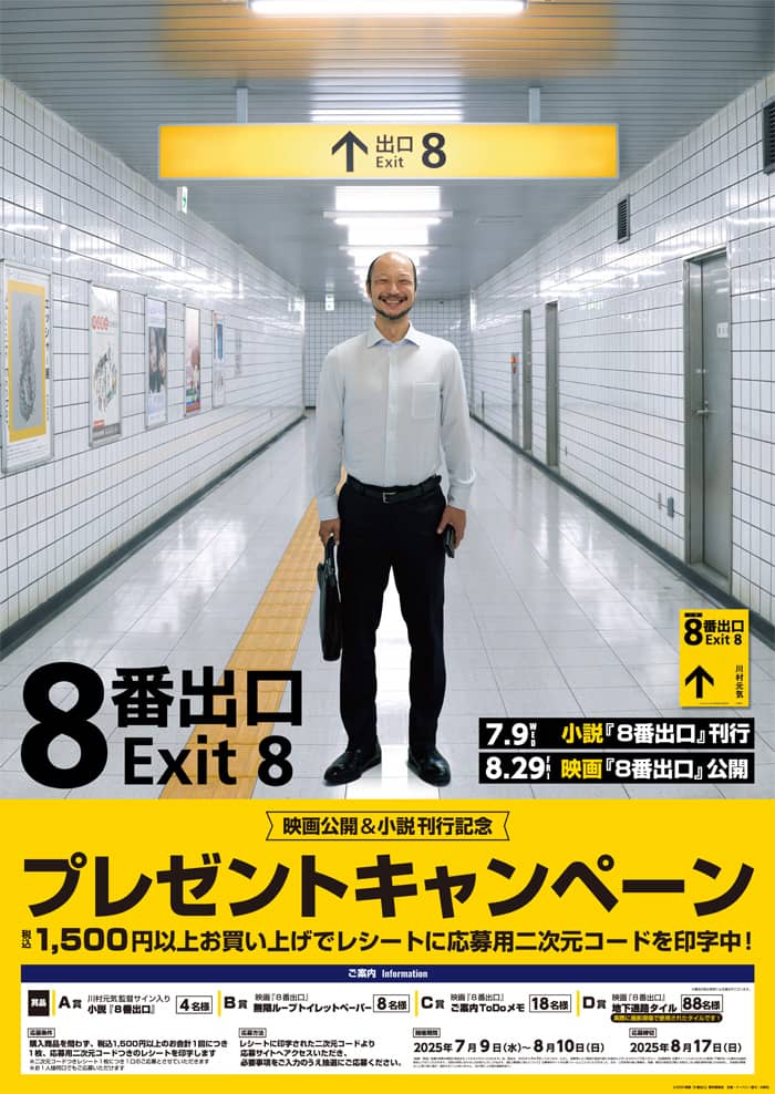 QRコードからキャンペーンに応募いただいた方の中から抽選で、川村元気監督サイン入り 小説『8番出口』や映画『8番出口』撮影現場で実際に使用されたタイルなど、豪華景品を合計118名様にプレゼントします。